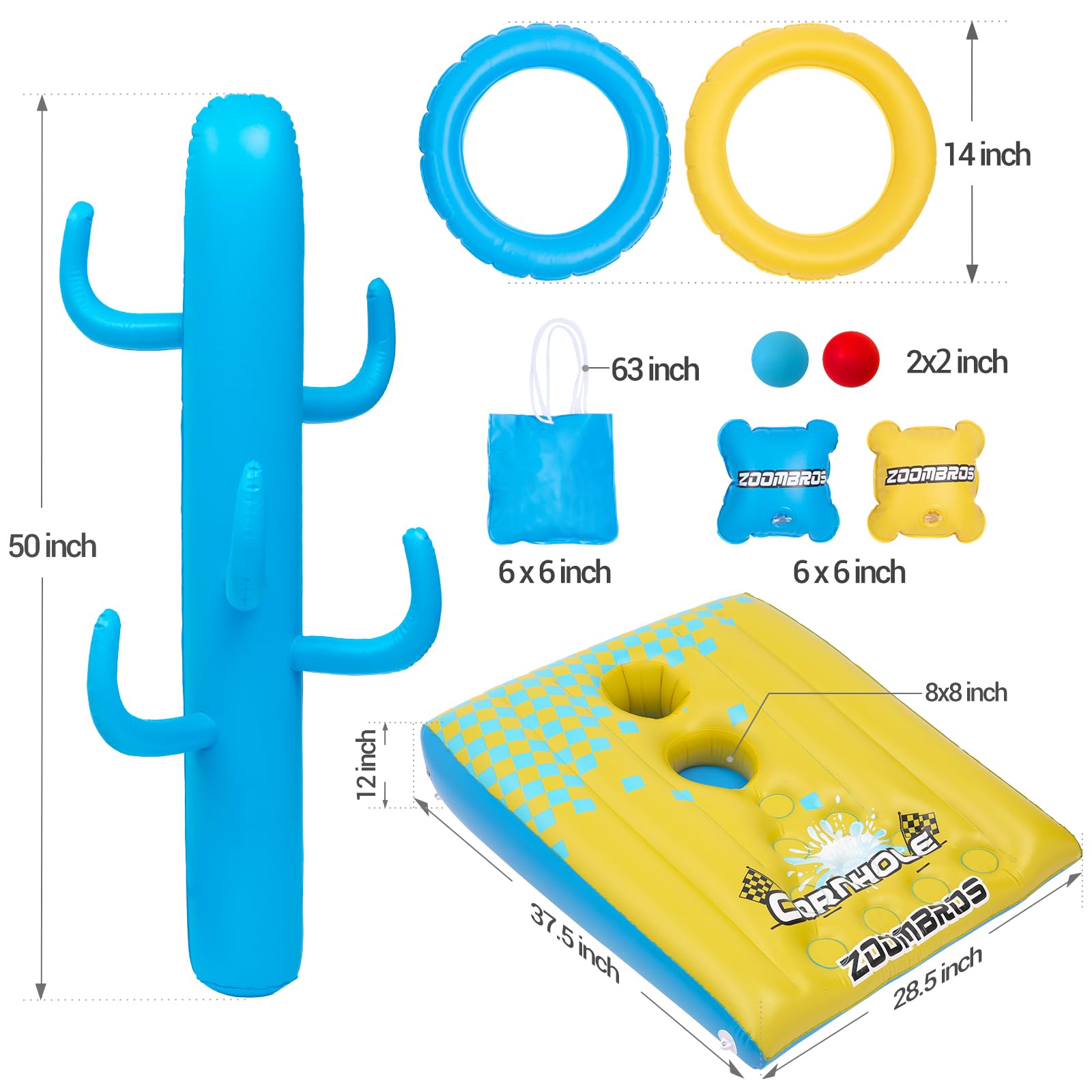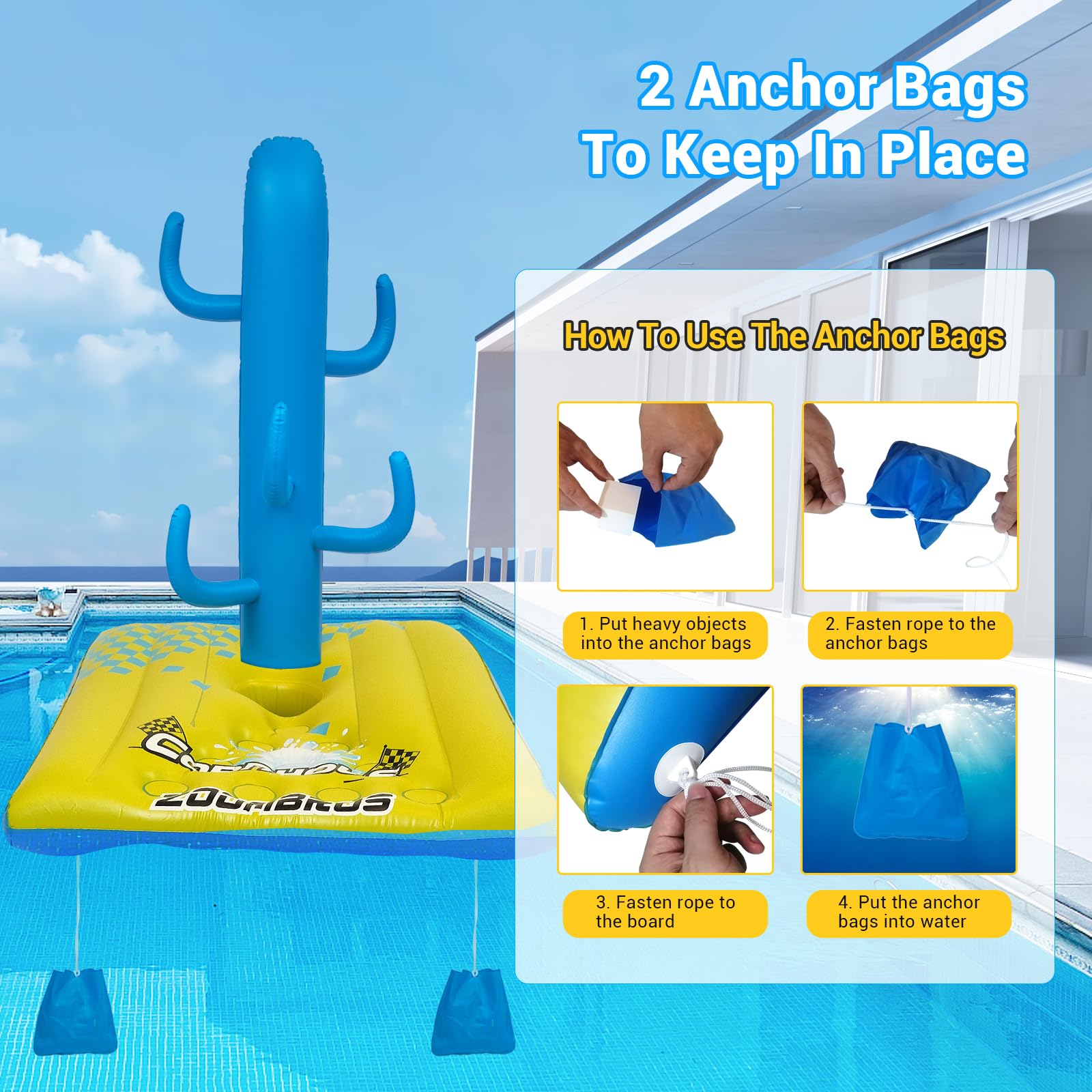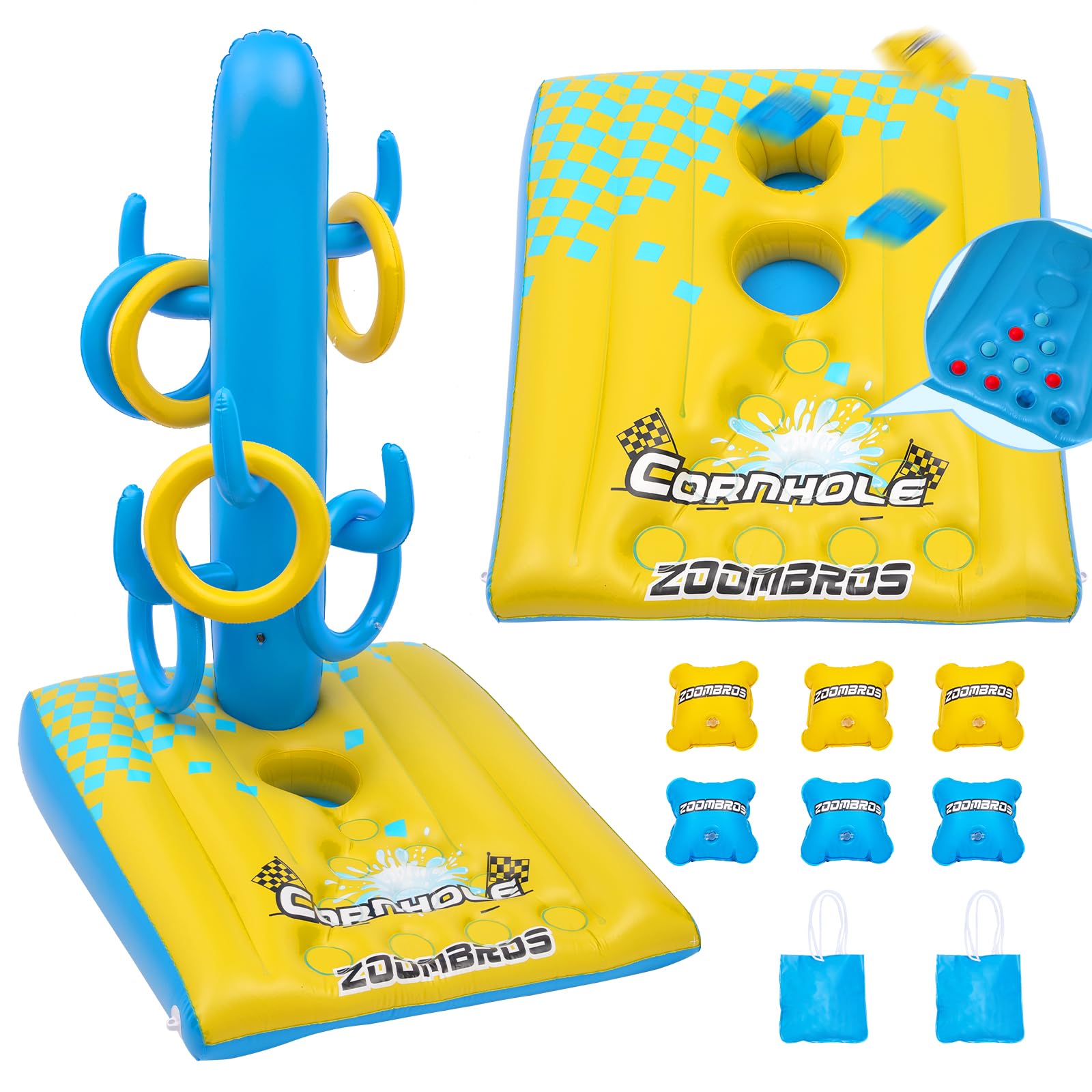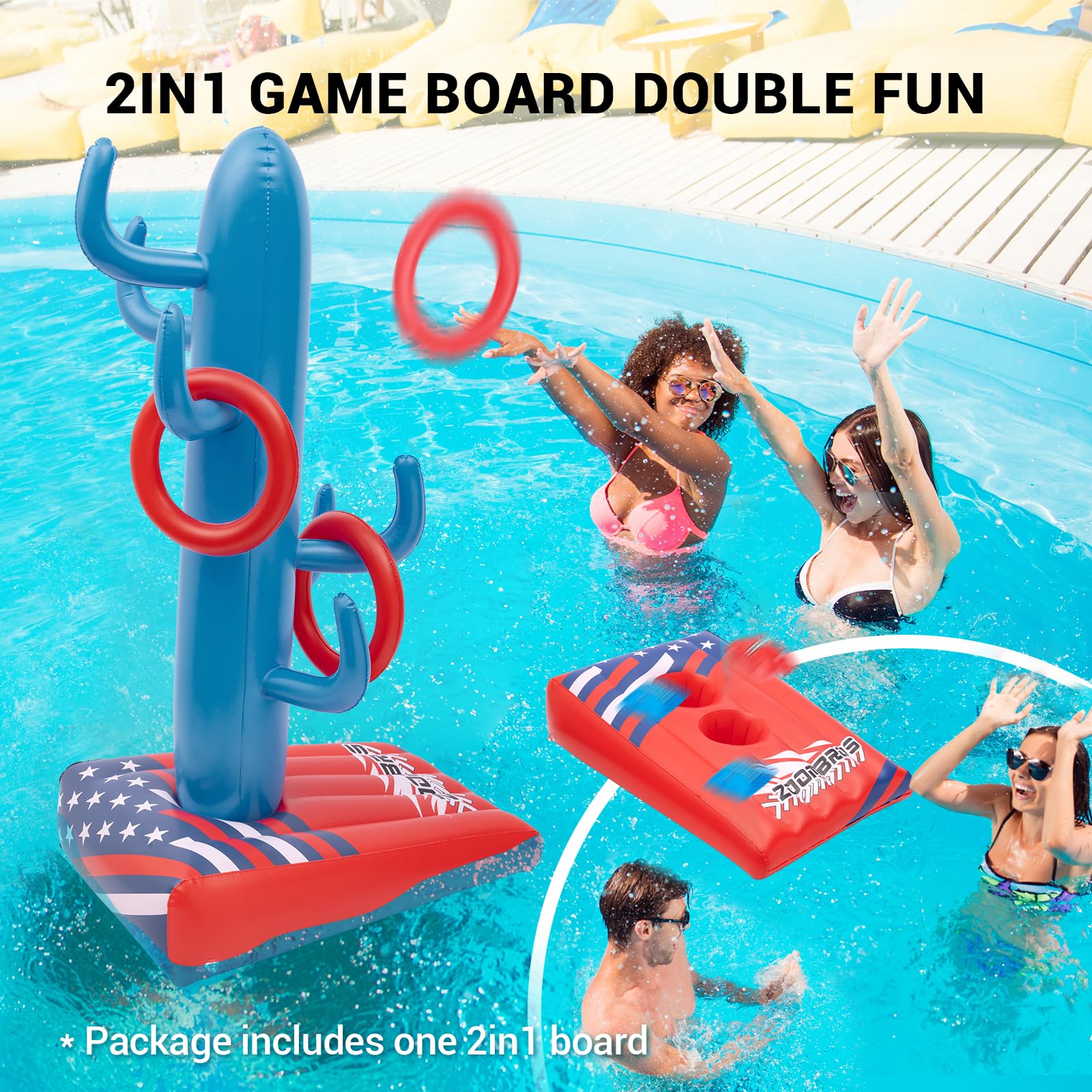 This 2in1 Pool Floating Cornhole set promises a fun-filled day of poolside entertainment with both cornhole and ring toss games. While it certainly delivers on the fun factor, there are a few things to consider before taking the plunge.Pros:* Versatile Entertainment: The combination of cornhole and ring toss makes this set great for a variety of ages and skill levels.* Durable Construction: The inflatable base is sturdy and designed for water use, offering a stable platform for gameplay.* Plenty of Accessories: The set comes with six bean bags and additional anchor bags for added stability, ensuring everyone has a chance to play.* Easy to Store: The inflatable design allows for easy storage and portability, making it perfect for pool parties or beach trips.Cons:* Limited Space: The inflatable base might not be suitable for larger groups, as it offers a limited playing area.* Stability Concerns: While the anchor bags help, the inflatable base can be susceptible to movement in choppy water, potentially disrupting gameplay.* Durability Concerns: The inflatable nature of the base makes it prone to punctures or tears, especially with rough handling.This 2in1 Pool Floating Cornhole set is a fun and engaging addition to any pool party. The versatility and ease of use make it a good option for families and groups with diverse skill levels. However, the limited playing area and potential stability issues might be drawbacks for larger groups or more competitive players.Recommendations:* Invest in a pump: The set doesn't come with a pump, so you'll need to purchase one separately.* Use caution in choppy water: The stability of the base can be compromised in rough water, so be mindful of conditions.* Consider a more robust alternative: If you're looking for a more durable option, traditional cornhole boards might be a better long-term investment.This 2in1 Pool Floating Cornhole set delivers on its promise of fun, but it's not without flaws. It's a great option for casual poolside entertainment, but might not be suitable for competitive play or large groups.