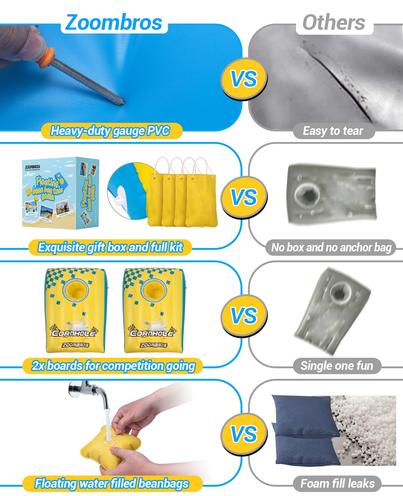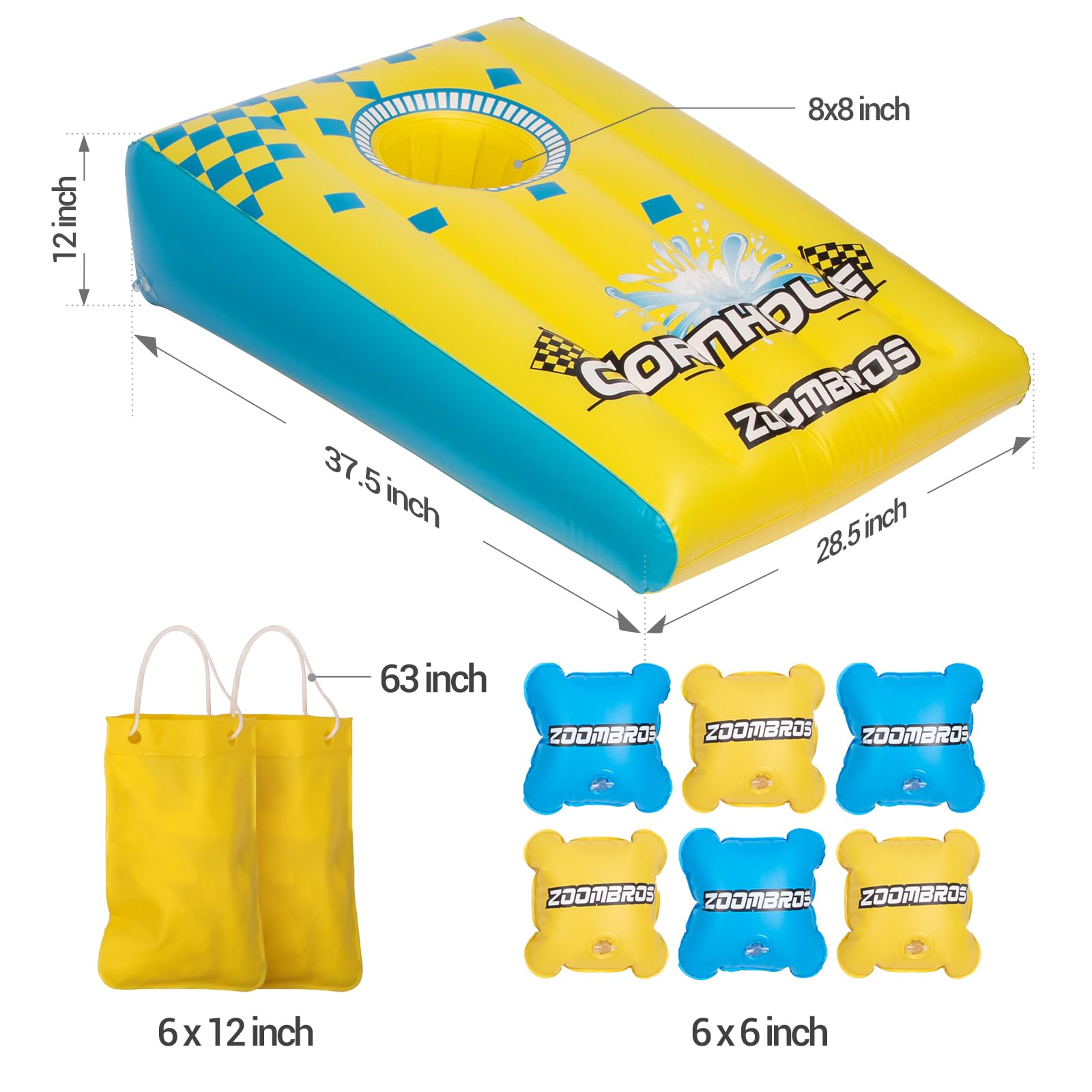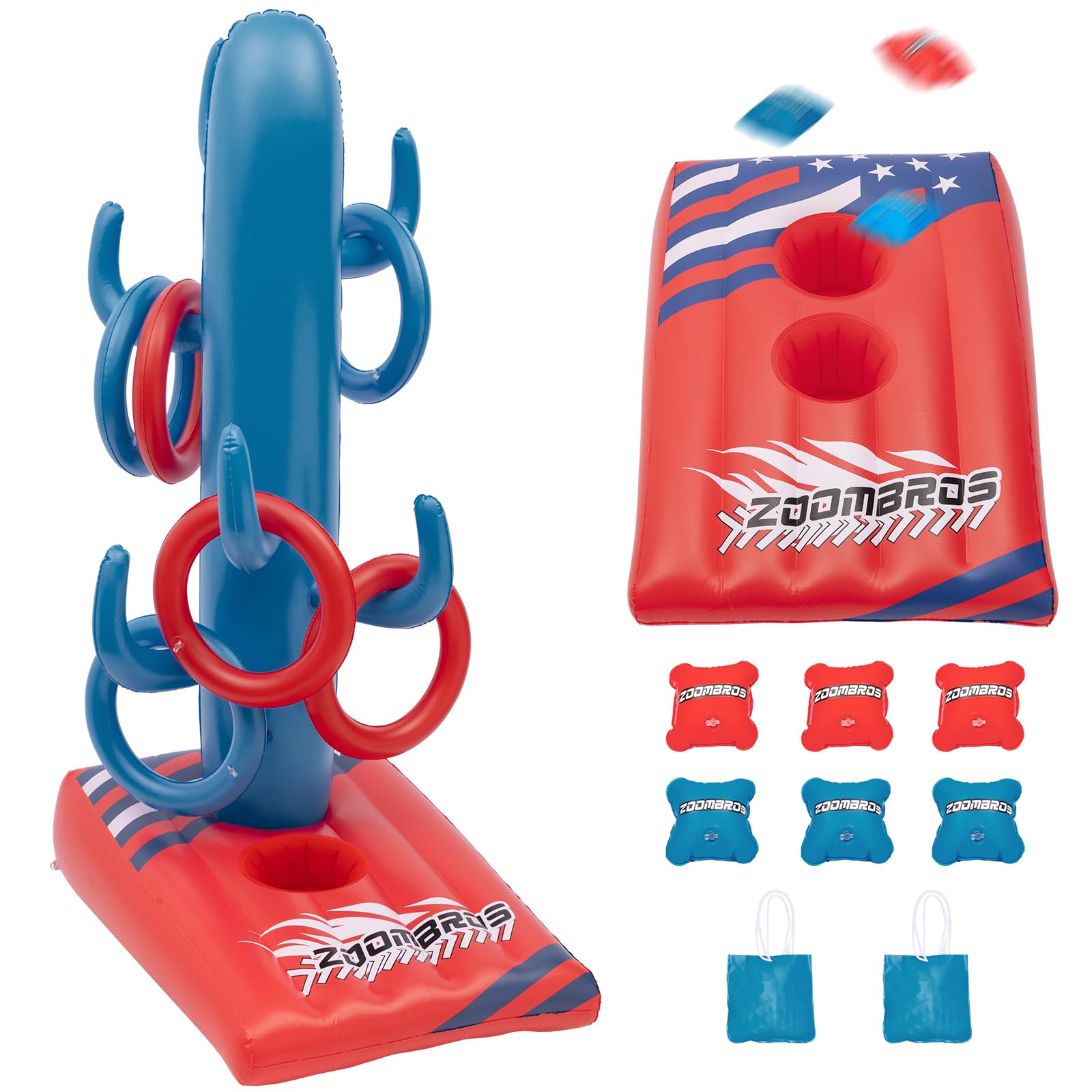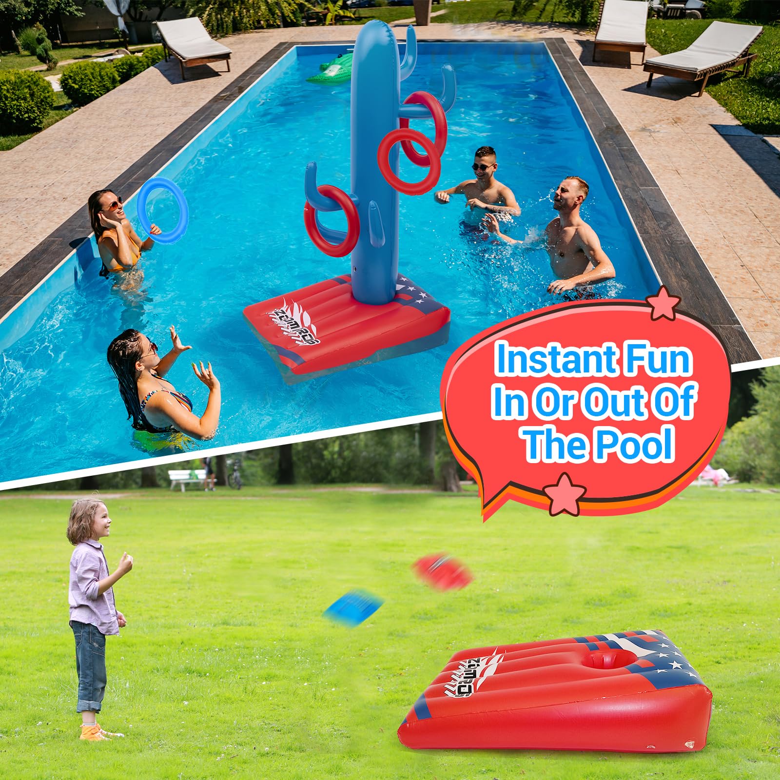This 2in1 Pool Floating Cornhole set promises a fun-filled day of poolside entertainment with both cornhole and ring toss games. While it certainly delivers on the fun factor, there are a few things to consider before taking the plunge.Pros:* Versatile Entertainment: The combination of cornhole and ring toss makes this set great for a variety of ages and skill levels.* Durable Construction: The inflatable base is sturdy and designed for water use, offering a stable platform for gameplay.* Plenty of Accessories: The set comes with six bean bags and additional anchor bags for added stability, ensuring everyone has a chance to play.* Easy to Store: The inflatable design allows for easy storage and portability, making it perfect for pool parties or beach trips.Cons:* Limited Space: The inflatable base might not be suitable for larger groups, as it offers a limited playing area.* Stability Concerns: While the anchor bags help, the inflatable base can be susceptible to movement in choppy water, potentially disrupting gameplay.* Durability Concerns: The inflatable nature of the base makes it prone to punctures or tears, especially with rough handling.This 2in1 Pool Floating Cornhole set is a fun and engaging addition to any pool party. The versatility and ease of use make it a good option for families and groups with diverse skill levels. However, the limited playing area and potential stability issues might be drawbacks for larger groups or more competitive players.Recommendations:* Invest in a pump: The set doesn't come with a pump, so you'll need to purchase one separately.* Use caution in choppy water: The stability of the base can be compromised in rough water, so be mindful of conditions.* Consider a more robust alternative: If you're looking for a more durable option, traditional cornhole boards might be a better long-term investment.This 2in1 Pool Floating Cornhole set delivers on its promise of fun, but it's not without flaws. It's a great option for casual poolside entertainment, but might not be suitable for competitive play or large groups.