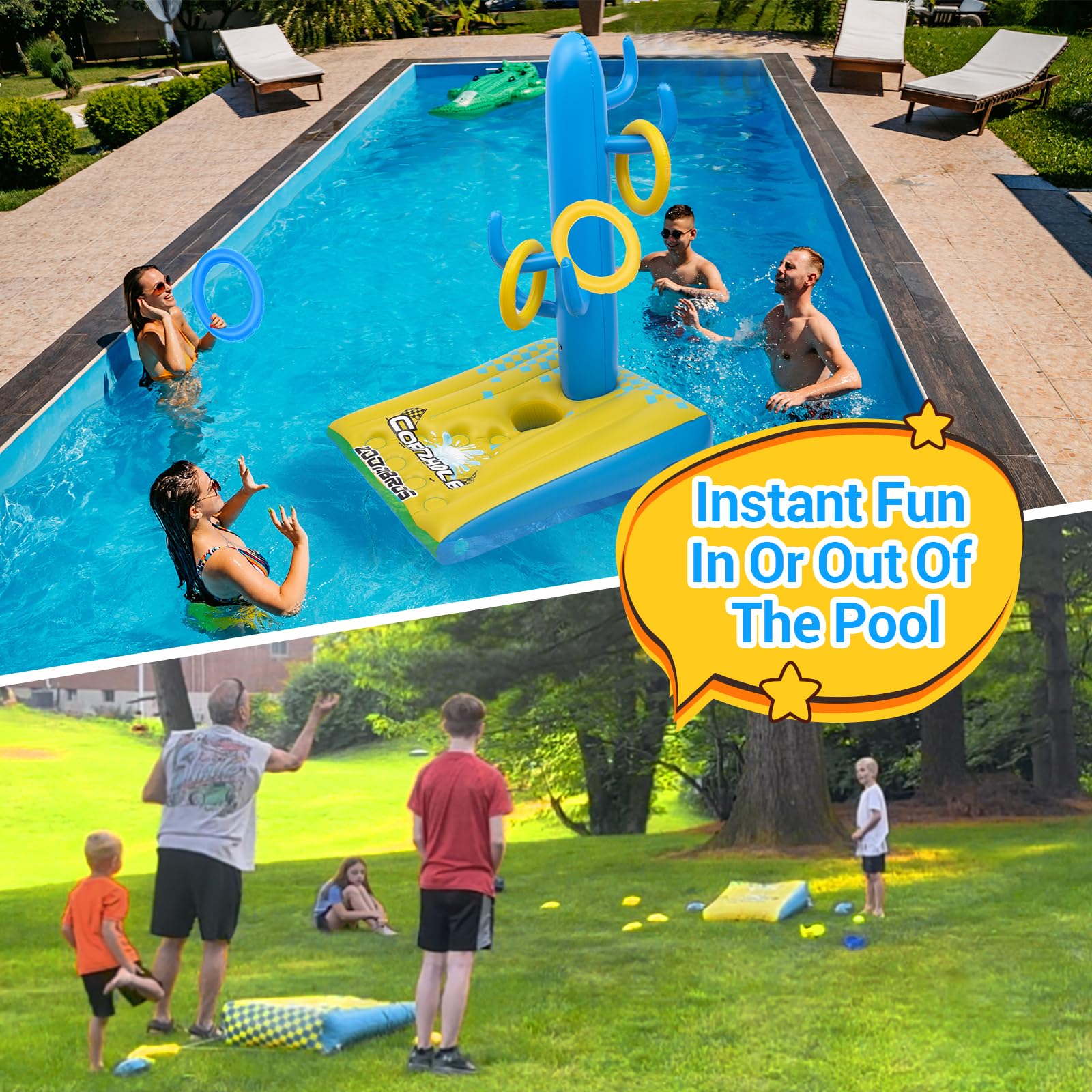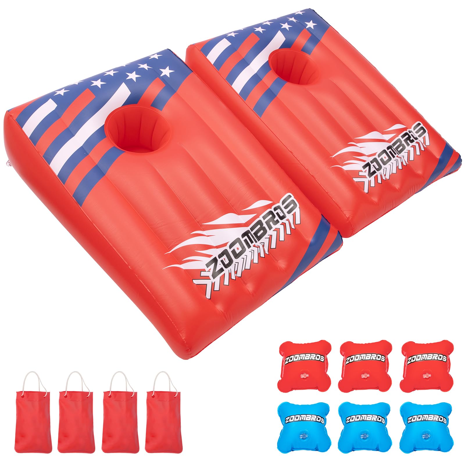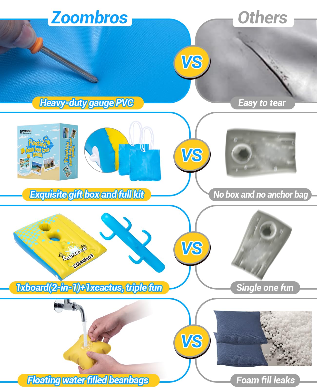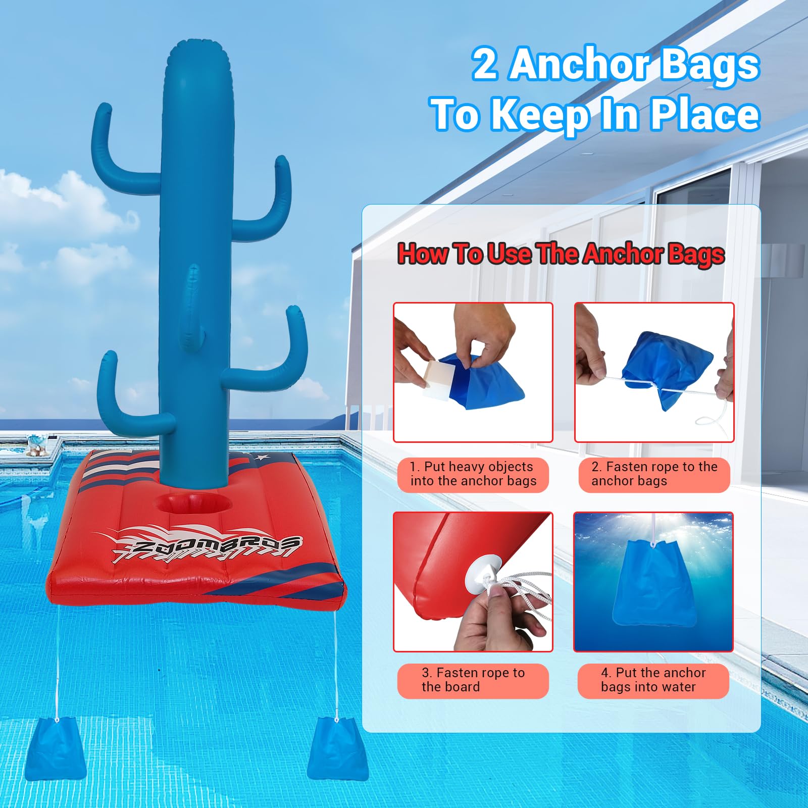 This 2in1 Pool Floating Cornhole set promises a fun-filled day of poolside entertainment with both cornhole and ring toss games. While it certainly delivers on the fun factor, there are a few things to consider before taking the plunge.Pros:* Versatile Entertainment: The combination of cornhole and ring toss makes this set great for a variety of ages and skill levels.* Durable Construction: The inflatable base is sturdy and designed for water use, offering a stable platform for gameplay.* Plenty of Accessories: The set comes with six bean bags and additional anchor bags for added stability, ensuring everyone has a chance to play.* Easy to Store: The inflatable design allows for easy storage and portability, making it perfect for pool parties or beach trips.Cons:* Limited Space: The inflatable base might not be suitable for larger groups, as it offers a limited playing area.* Stability Concerns: While the anchor bags help, the inflatable base can be susceptible to movement in choppy water, potentially disrupting gameplay.* Durability Concerns: The inflatable nature of the base makes it prone to punctures or tears, especially with rough handling.This 2in1 Pool Floating Cornhole set is a fun and engaging addition to any pool party. The versatility and ease of use make it a good option for families and groups with diverse skill levels. However, the limited playing area and potential stability issues might be drawbacks for larger groups or more competitive players.Recommendations:* Invest in a pump: The set doesn't come with a pump, so you'll need to purchase one separately.* Use caution in choppy water: The stability of the base can be compromised in rough water, so be mindful of conditions.* Consider a more robust alternative: If you're looking for a more durable option, traditional cornhole boards might be a better long-term investment.This 2in1 Pool Floating Cornhole set delivers on its promise of fun, but it's not without flaws. It's a great option for casual poolside entertainment, but might not be suitable for competitive play or large groups.